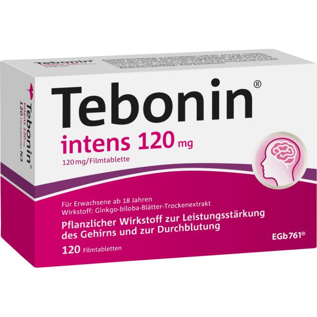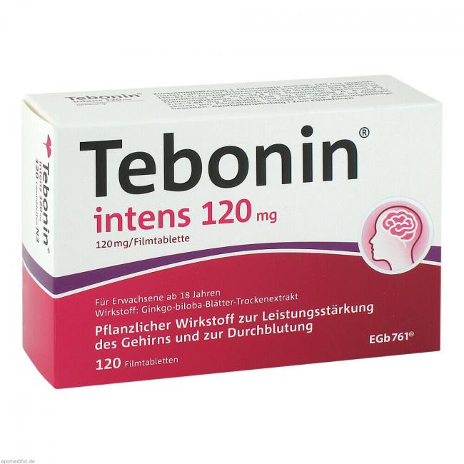 Tebonin intens 120 mg Filmtablette. Wirkstoff: Ginkgo-biloba-Blätter-Trockenextrakt. Anwendungsgebiete: zur symptomatischen Behandlung von hirnorganisch bedingten geistigen Leistungseinbußen. Die Anwendung erfolgt im Rahmen eines therapeutischen Gesamtkonzeptes bei fortschreitender Abnahme bzw. Verlust erworbener geistiger Fähigkeiten (dementielles Syndrom) mit den Hauptbeschwerden: Gedächtnisstörungen, Konzentrationsstörungen, Niedergeschlagenheit, Schwindel, Ohrensausen, Kopfschmerzen; zur Verlängerung der schmerzfreien Gehstrecke bei arterieller Verschlusskrankheit in den Gliedmaßen, sog. "Schaufensterkrankheit" (Claudicatio intermittens im Stadium II nach FONTAINE) im Rahmen physikalisch-therapeutischer Maßnahmen, insbesondere Gehtraining; bei Schwindel infolge von Durchblutungsstörungen oder altersbedingten Rückbildungsvorgängen (Vertigo vaskulärer und involutiver Genese); zur unterstützenden Behandlung von Ohrgeräuschen infolge von Durchblutungsstörungen oder altersbedingten Rückbildungsvorgängen (Tinnitus vaskulärer und involutiver Genese).