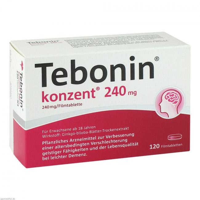 Tebonin konzent 240 mg Filmtabletten. Wirkstoff: Ginkgo-biloba-Blätter-Trockenextrakt. Anwendungsgebiete: als pflanzliches Arzneimittel zur Besserung von (alters-assoziierten) geistigen Leistungseinbußen und zur Verbesserung der Lebensqualität bei leichter Demenz.