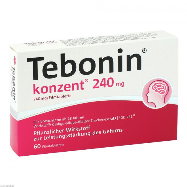 Tebonin konzent 240 mg Filmtabletten. Wirkstoff: Ginkgo-biloba-Blätter-Trockenextrakt. Anwendungsgebiete: als pflanzliches Arzneimittel zur Besserung von (alters-assoziierten) geistigen Leistungseinbußen und zur Verbesserung der Lebensqualität bei leichter Demenz.