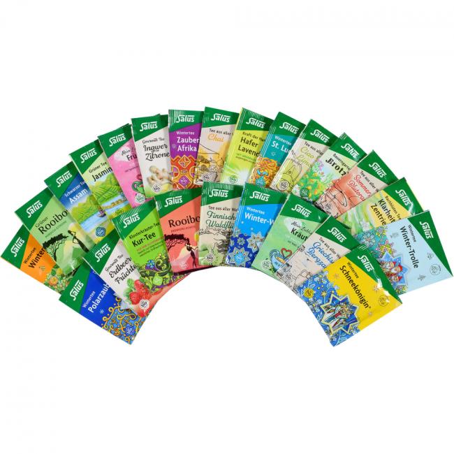 Polarzauber - mit süßem Waldbeeren-Geschmack: Früchte-Gewürztee, aromatisiert: Hibiskusblüten*, Hagebuttenschalen*, Zimt* (14%), Äpfel*, Heidelbeeren* (10%), Holunderbeeren*, natürliches Rote Früchte-Aroma*, Honigbuschzweigspitzen*, Johannisbeeren schwarz*, Gewürznelken*. Cistus Salbei - schmeckt intensiv nach Salbei mit einer minzig-herben Note: Kräutertee: Cistuskraut* (40%), Salbeiblätter* (14%), Pfefferminzblätter*, Hagebuttenschalen*, Eukalyptusblätter*, Ingwer*, Süßholzwurzel*, Lindenblüten*, Holunderblüten*, Ysopkraut*, Kamillenblüten*. Kurkuma Lemongras und Blüten - blumig-fruchtiger Gewürz-Kräutertee: Gewürz-Kräutertee: Kurkuma* (45%), Lemongras* (11%), Holunderblüten*, Hagebuttenschalen*, Lindenblüten*, Kamillenblüten*, Ingwer*, Rosenblütenblätter*. Grüner Tee Sencha - anregend und aromatisch mild im Geschmack: Grüner Tee*. St. Lucia - mit köstlichem Geschmack nach Apfel, Vanille und Zimt: Kräuter-Früchtetee, aromatisiert: Apfelfrüchte* (25%), Quitten*, Zimt* (13%), Hibiskusblüten*, Hagebuttenschalen*, Honigbuschzweigspitzen*, Sanddorn*, Gewürznelken*, natürliches Rote Früchte-Aroma*, Zitronenmyrtenblätter*, Vanilleschoten*. Abendtee - mit feinen Lindenblüten: Kräuter-Früchtetee: Melissenblätter*, Apfelfrüchte*, Hagebuttenschalen*, Johannisbeeren schwarz*, Erdbeerblätter*, Kamillenblüten*, Brennnesselblätter*, Lindenblüten* (6%), Schafgarbenkraut*, Lavendelblüten*, Hopfenzapfen*. Winter-Trolle - mit toller Kakaonote: Gewürztee: Kurkumawurzel*, Kakaoschalen* (30%), Anisfrüchte*, Korianderfrüchte*, Zichorienwurzel*, Zimtrinde*, Gewürznelken*. Zauberhaftes Afrika - weihnachtlich mit Mandarine und Zimt: Kräutertee mit Rooibos, aromatisiert: Rooiboszweigspitzen* (40%), Zimt*, Gerstenmalz*, Orangenschalen süß*, Honigbuschzweigspitzen*, Kakaoschalen*, Fenchelfrüchte süß*, Süßholzwurzel*, Mandarinenextrakt*, Gewürznelken*. Motivation und Zuversicht - Kräutertee mit Bio Bachblüten-Essenzen: Kräutertee: Grüne Rooiboszweigspitzen*, Melissenblätter*, Zitronenverbenenblätter*, Kardamomfrüchte*, Rosmarinblätter*, Walnussblätter*, Kamillenblüten*,Süßholzwurzel*, Pfefferfrüchte rosa*, Grüner Tee Jasmin*, Sonnenblumenblütenblätter*, Bachblütenmischung* (Auszug aus Gentian* [Herbstenzian], Hornbeam* [Hainbuche], Oak* [Eiche], Scleranthus* [Knäuelkraut] und Sweet Chestnut* [Edelkastanie]). Echinacea Sanddorn - mit natürlichem Vitamin C: Kräuter-Früchtetee: Echinaceakraut* (20%), Hibiskusblüten*, Sanddorn* (14%), Apfelfrüchte*, Hagebuttenschalen*, Honigbuschzweigspitzen*, Ingwer*, Acerolasaftpulver* (3,5%), Zitronenmyrtenblätter*, Brombeerblätter süß*. Ingwer Orange-Spicy - fruchtig scharf, kombiniert mit edlen Gewürzen: Gewürz-Kräutertee: Ingwer* (34%), Süßholzwurzel*, Orangenschalen süß* (13%), Zimt*, Anisfrüchte*, Korianderfrüchte*, Kardamomfrüchte*, Brombeerblätter*, Muskatsamen*, Sanddorn*. Mein Lieblings-Früchtetee - mit Sanddorn und zarten Waldbeerengeschmack: Früchtetee, aromatisiert: Hibiskusblüten*, Äpfel*, Sanddorn* (15%), Lemongras*, Orangenschalen süß*, Johannisbeeren schwarz*, natürliches Rote Früchte Aroma*, Hagebuttenschalen* (3%), Holunderbeeren* (3%), Weißdornfrüchte*, Rote Bete*, Holunderblüten*, Nanaminzblätter*. Energie Tee - würzig-frisch, mit Hagebutte: Kräutertee: Sanddorn*, Hagebuttenschalen*, Grünes Haferkraut*, Holunderblüten*, Weißdornfrüchte*, Zitronenverbenenblätter*, Rosmarinblätter*, Galgant*, Fenchelfrüchte bitter*, Ringelblumenblüten*. Darjeeling Schwarzer Tee - milde erlesene Spitzenqualität: Schwarzer Tee*. Rooibos Pfirsich-Zitrone - mit feinen Zitronenstückchen: Kräuter-Früchtetee, aromatisiert: Grüne Rooiboszweigspitzen* (50%), Lemongras*, weiße Hibiskusblüten*, Zitronenfruchtstücke* (8%), Brombeerblätter süß*, Äpfel*, natürliches Pfirsicharoma*. Morgentee - erfrischender Kräutertee mit Gundelrebe: Kräuter-Früchtetee: Apfelfrüchte*, Preiselbeeren*, Hagebuttenschalen*, Apfelminzblätter*, Fenchelfrüchte süß*, Holunderblüten*, Gundelrebenkraut* (6%), Rosmarinblätter*, Walnussblätter*, Salbeiblätter*. Winter-Wichtel - nuancenreich mit feinen Gewürzen: Gewürztee: Gerstenmalz*, Zichorienwurzel*, Honigbuschzweigspitzen*, Zimt*, Ingwer*, Süßholzwurzel*, Kardamomfrüchte* (5%), Gewürznelken*, Pfefferfrüchte schwarz*. Weißer Blütenzauber - mit zart duftenden Blütenblättern und Weißem Tee: Kräutertee mit 45% Weißem und 7% Grünem Tee: Weißer Tee Pai Mu Tan* (45%), Apfelfrüchte*, Holunderblüten*, Rotkleeblüten* und -kraut* (7%), Grüner Tee Jasmin* (7%), Lindenblüten*, Rosenblütenblätter*, Sonnenblumenblütenblätter*. Freude und Harmonie - Früchte-Gewürztee mit Bio Bachblüten-Essenzen: Früchte-Gewürztee: Quittenfrüchte*, Hibiskusblüten*, Hagebuttenschalen*, Orangenschalen süß*, Granatapfelschalen*, Holunderblüten*, Johannisbeerfrüchte schwarz*, Zimt*, Erdbeerfrüchte*, Vanilleschoten*, Lavendelblüten*, Bachblütenmischung* (Auszug aus Vervain* [Verbene], Wild Oat* [Waldtrespe], Olive* [Olivenbaum], Larch* [Lärche], Holly* [Stechpalmenblüten] und Mustard* [Ackersenf]). Rooibos Erdbeere-Kokos - mit fruchtigen Erdbeerstücken: Kräuter-Früchtetee, aromatisiert: Rooiboszweigspitzen* (39%), Äpfel*, Honigbuschzweigspitzen*, Lemongras*, weiße Hibiskusblüten*, Süßholzwurzel*, natürliches Kokosaroma*, natürliches Erdbeeraroma*, Erdbeerfruchtstücke* (2%). Winter-Hexe - mit mildem Schwarzen Tee und feinen Orangenschalen: Kräuter-Gewürztee mit 25% Schwarzem Tee, aromatisiert: Schwarzer Tee Ceylon* (25%), Anisfrüchte*, Gerstenmalz*, Orangenschalen süß* (10%), Honigbuschzweigspitzen*, Apfelfrüchte*, Zitronenschalen* (5%), natürliches Orangenaroma*, Zitronenmyrtenblätter*, Gewürznelken*. Hafer Lavendel - mit zart blumiger Geschmacksnuance: Kräutertee: Grünes Haferkraut* (15%), Gerstengras*, Echtes Goldrutenkraut*, Apfelfrüchte*, Melissenblätter* (10%), Hagebuttenschalen*, Fenchelfrücht