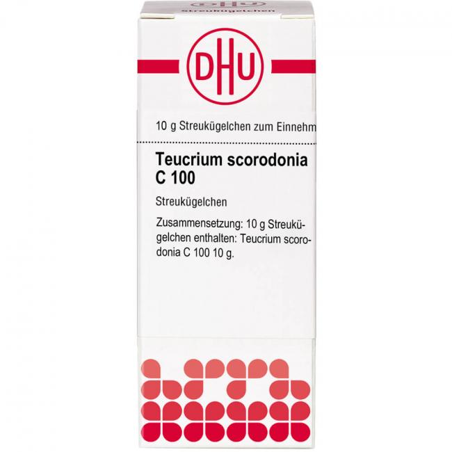 Teucrium scorodonia C 100. Anwendungsgebiete: Registriertes homöopathisches Arzneimittel, daher ohne Angabe einer therapeutischen Indikation. Warnhinweis: Dieses Arzneimittel enthält Sucrose (Saccharose / Zucker).