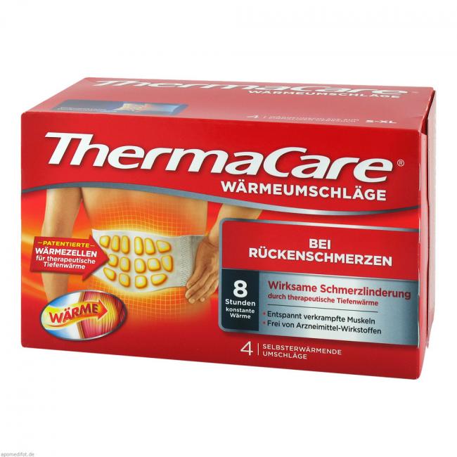 ThermaCare Rückenumschläge: Wohltuende Wärme für den unteren Rücken. ThermaCare Produkt für den unteren Rücken. Die Wärmeumschläge von ThermaCare lindern akute Schmerzen in der Muskulatur, den Gelenken oder dem Gewebe im unteren Rückenbereich. Die natürliche, aber sehr effektive Wirkung wird durch eine Kombination aus Tiefenwärme (therapeutische 40°C) und Langzeitwärme (für mind. acht Stunden) erreicht. Während der Anwendung sind die dünnen ThermaCare Rückenumschläge komfortabel und diskret unter der Kleidung zu tragen und unterstützen so die Mobilität im Alltag.