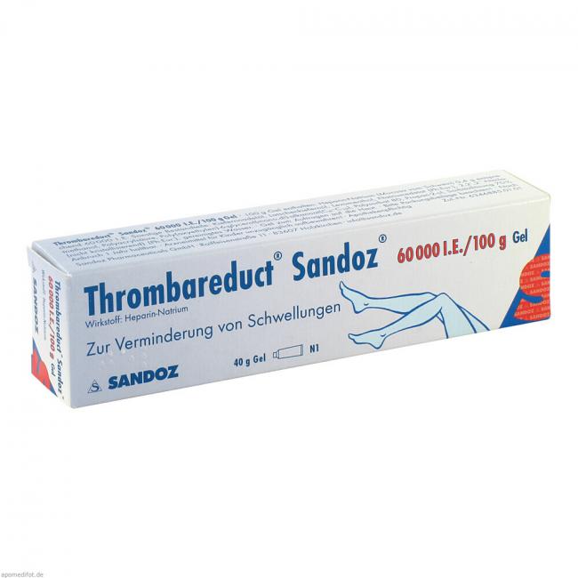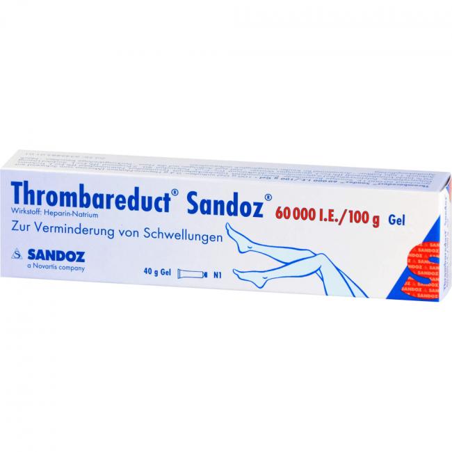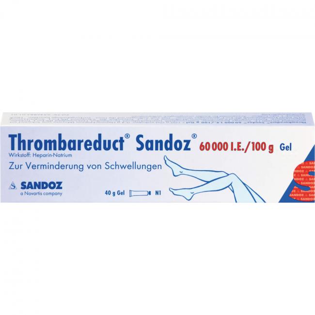 Thrombareduct Sandoz 60.000 I.E./100 g Gel Wirkstoff: Heparin-Natrium. Anwendungsgebiete: zur unterstützenden Behandlung bei akuten Schwellungszuständen nach stumpfen Verletzungen (Prellungen/Blutergüsse) und bei oberflächlicher Venenentzündung, sofern diese nicht durch Kompression behandelt werden kann.