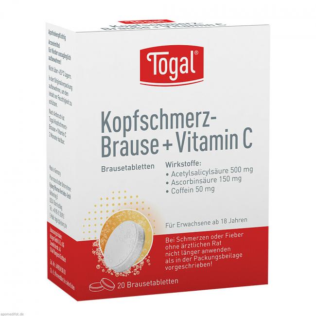 Togal Kopfschmerz-Brause + Vitamin C sind weißliche, runde Brausetabletten mit facettiertem Rand. Togal Kopfschmerz-Brause + Vitamin C ist in Packungen mit 10 und 20 Brausetabletten erhältlich. Es werden möglicherweise nicht alle Packungsgrößen in den Verkehr gebracht.