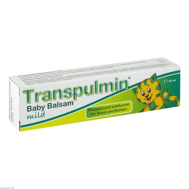 Transpulmin Baby Balsam mild ist ein Kosmetikum mit einer ausgewogenen Mischung ätherischer Öle. Sanft auf Brust und Rücken einmassiert, pflegt es die zarte Babyhaut, hilft Ihrem Kind zu entspannen und trägt so zu einem höheren Wohlbefinden bei. Denn liebevolles Streicheln bzw. Massieren löst im Körper Ihres Babys zusätzlich positive Vorgänge aus: Die Durchblutung der Haut wird gefördert und die massierten Stellen werden dadurch angenehm erwärmt, die Atmung Ihres Kindes wird erleichtert und gleichmäßiger. Besonders angenehm ist die Pflege mit Transpulmin Baby Balsam mild bei Erkältungsgefahr. Der beim Einmassieren entstehende wohltuende Duft der ätherischen Öle lässt ihr Kind zusätzlich entspannt und ruhig atmen.