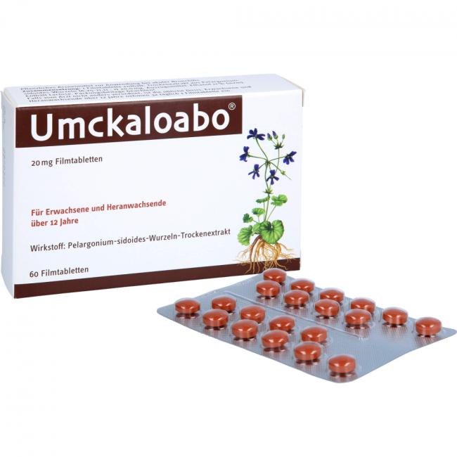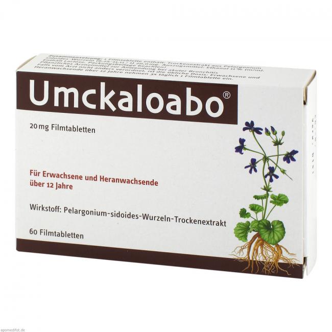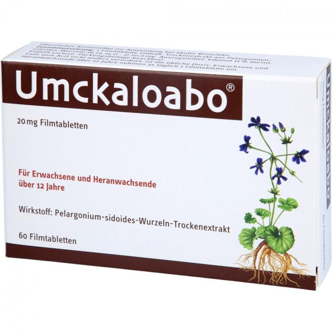 Umckaloabo 20 mg Filmtabletten. Wirkstoff: Pelargonium-sidoides-Wurzeln-Auszug, getrocknet. Anwendungsgebiete: zur symptomatischen Behandlung der akuten Bronchitis (Entzündung der Bronchien).