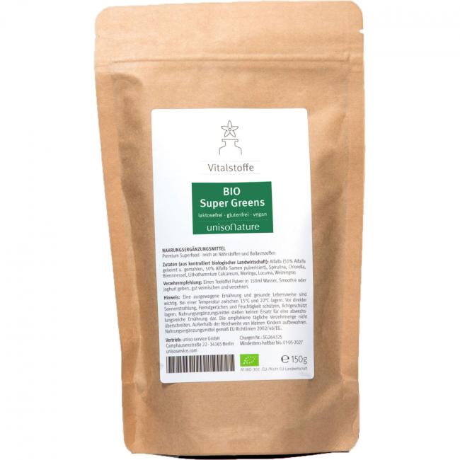 Pflichtangaben UNISONATURE Bio Super Greens Plv.z.H.e.L.z.Einn., 150 Gramm