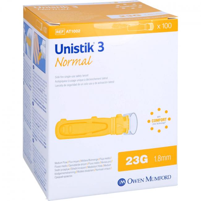- Unistik 3 Normal: Lanzette 23 G, Einstichtiefe 1,8 mm