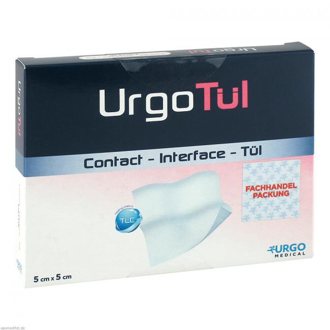 - UrgoTül haftet an chirurgischen Einmalhandschuhen aus Latex. Um die Handhabung von UrgoTül zu erleichtern, ist es ratsam, die Handschuhe mit physiologischer Kochsalzlösung zu befeuchten.