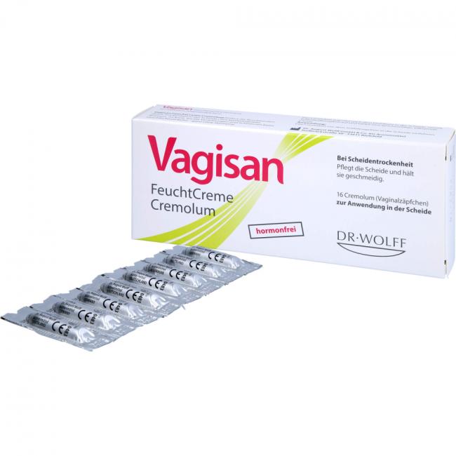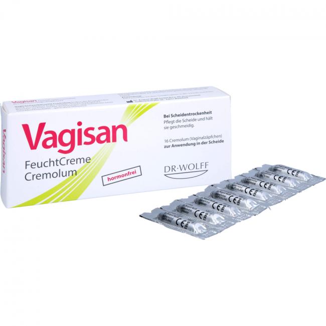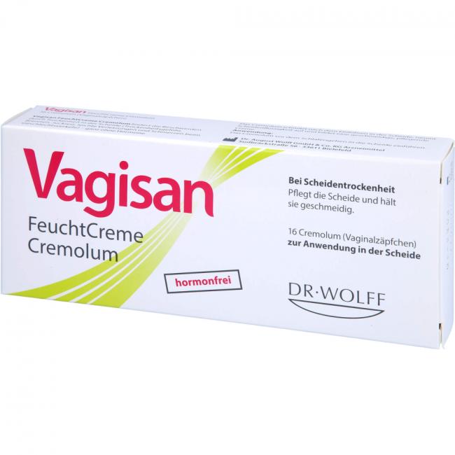 Vagisan FeuchtCreme Cremolum ist ein Vaginalzäpfchen, das nach dem Einführen in der Scheide schmilzt, vorhandene Scheidenflüssigkeit aufnimmt und damit eine geschmeidige und pflegende Creme bildet. Auf diese Weise können die durch Trockenheit verschiedener Ursache ausgelösten Beschwerden in der Scheide (z. B. Trockenheitsgefühl, Brennen, Juckreiz, leichte Verletzungen und Schmerzen) gelindert werden. Vagisan FeuchtCreme Cremolum enthält den Zusatz eines Milchsäure-Calciumlactat-Puffers, der bewirkt, dass die sich in der Scheide bildende Creme einen pH-Wert (Säurewert) von ca. 4,5 aufweist. Da der normale Säurewert in der Scheide bei 3,8 bis 4,5 liegt, trägt das Milchsäure-Puffersystem in Vagisan Feucht-Creme Cremolum zur Erhaltung eines gesunden Scheidenmilieus bei. Vagisan FeuchtCreme Cremolum ist frei von Hormonen und kann ggf. auch zusammen mit einer Hormonersatztherapie oder im Wechsel mit Hormon-(Östrogen-)haltigen Vaginalcremes oder -zäpfchen angewandt werden. Die regelmäßige Anwendung von Vagisan FeuchtCreme Cremolum kann dazu beitragen, Reizungen und Entzündungen in der Scheide vorzubeugen.
