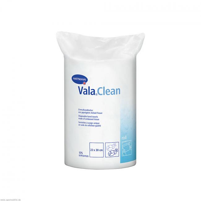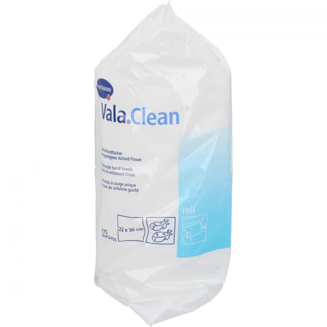 Einmal-Handtücher aus hochsaugfähigem Spezialtissue, in praktischer Rollenform, einzeln perforiert und leicht abzureißen; Rollen zu 175 Stück; 22x30 cm; für eine praktische Entnahme steht die ValaClean box zur Verfügung.