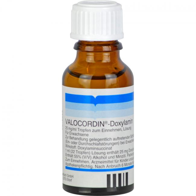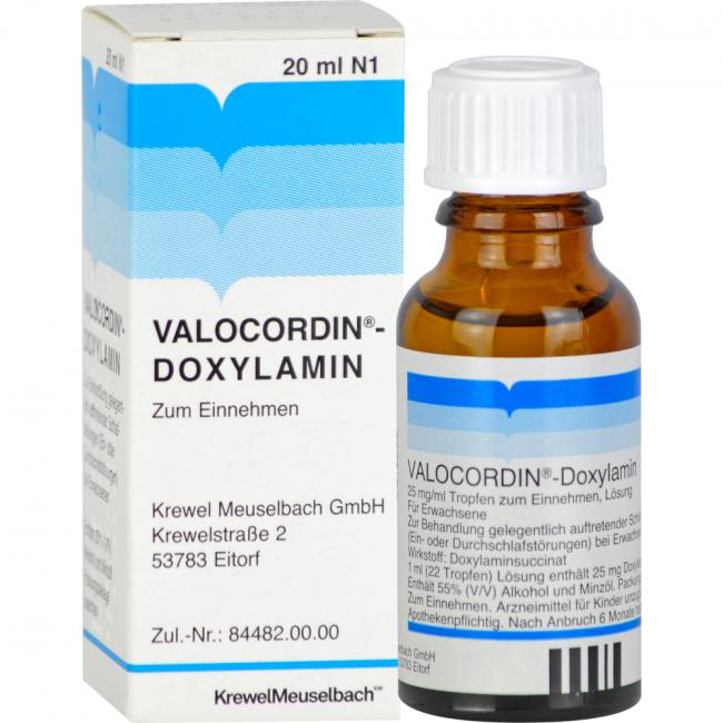 Tropfen zum Einnehmen, Lösung. Valocordin-Doxylamin ist eine klare, farblose Flüssigkeit. Valocordin-Doxylamin ist in Packungen mit 20 ml (N1) und 50 ml (N2) erhältlich.