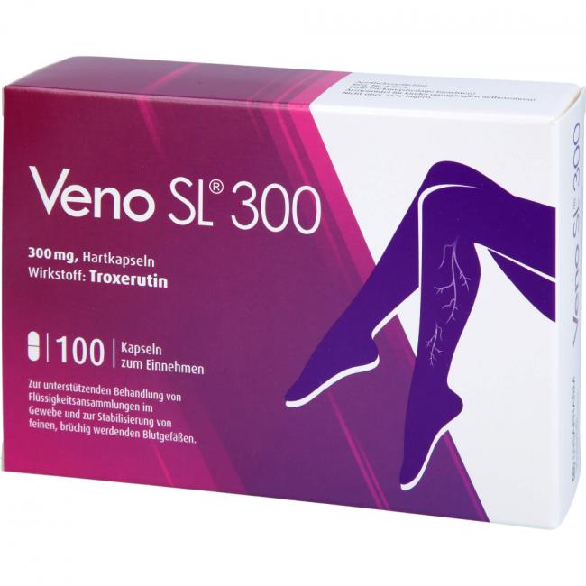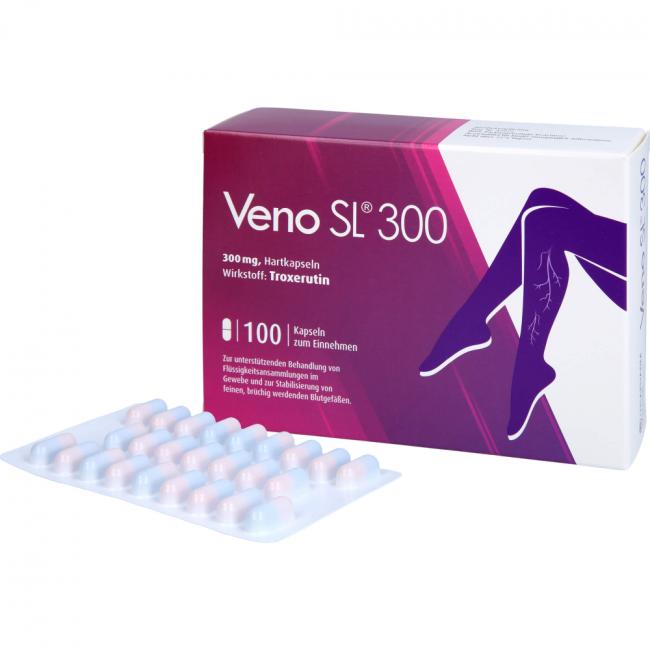 Veno SL 300, 300 mg Hartkapseln. Wirkstoff: Troxerutin. Anwendungsgebiete: Entgegenwirken der Bildung von Ödemen (Ödemprotektivum); Verbesserung der Fließfähigkeit des Blutes: unterstützende Behandlung bei Flüssigkeitsansammlungen im Gewebe (exsudative Prozesse); Stabilisierung von feinen, brüchig werdenden Blutgefäßen (Kapillarfragilität).