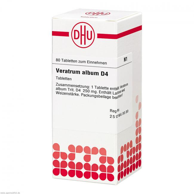 Veratrum Album D 4. Anwendungsgebiete: Registriertes homöopathisches Arzneimittel daher ohne Angabe einer therapeutischen Indikation. Warnhinweis: Enthält Lactose (Milchzucker) und Weizenstärke.