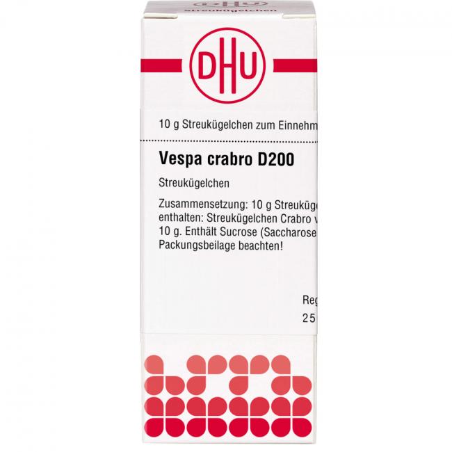 Vespa Crabro D 200. Anwendungsgebiete: Registriertes homöopathisches Arzneimittel, daher ohne Angabe einer therapeutischen Indikation. Warnhinweis: Dieses Arzneimittel enthält Sucrose (Saccharose / Zucker).