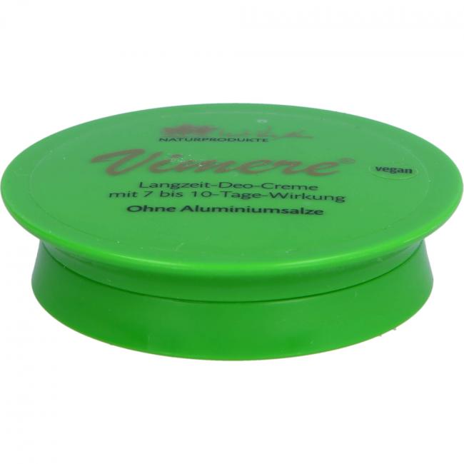 Vimere Deo Creme ist ein ganz anderes Deo. Es entzieht bis zu zehn Tage lang den Hautbakterien und -pilzen die Lebensgrundlage. Vimere besteht aus wertvollen Natursubstanzen (ohne Aluminium) und nutzt Vitamin C als natürliches Konservierungsmittel. Die Langzeitwirkung (bis zu zehn Tage) sichert Ihnen Schutz vor Geruchsproblemen und ist dabei hautfreundlich und pflegewirksam. Erfolgreich auch gegen den Geruch von Fußschweiß (Turnschuhe!). Unveränderte Rezeptur seit 1990.