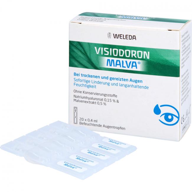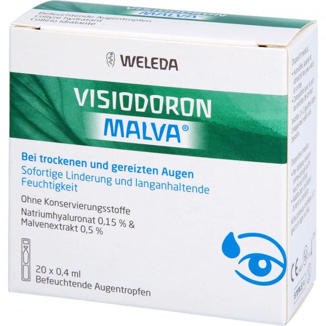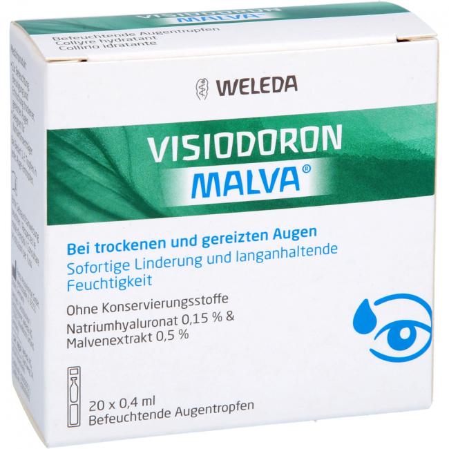 Visiodoron Malva Monodosen-Augentropfen mit Natriumhyaluronat und MalvenextraktAnwendungsgebiete: Natriumhyaluronat stabilisiert den Tränenfilm und Malvenextrakt beruhigt und spendet Feuchtigkeit.