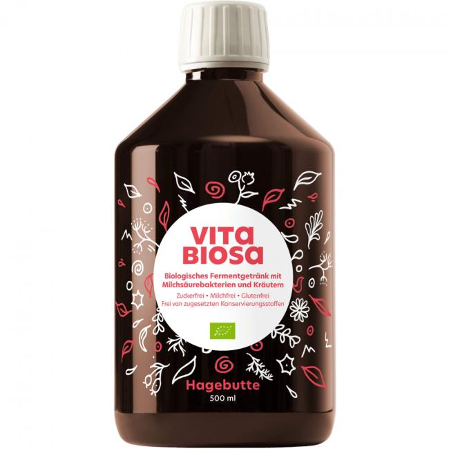 Vita Biosa Hagebutte ist ein lebendiges Produkt. Frisch abgefüllt enthält es mindesten 100 Millionen aktive Mikroorganismen pro ml. Es ist zuckerfrei, da die Mikroorganismen während der Fermentation den gesamten Zucker abbauen. Vita Biosa Hagebutte ist frei von Konservierungsmitteln, Milch und Lactose. Überdruck und Flockenbildung können vorkommen. Enthält Süßholz - bei hohem Blutdruck sollte dieses Getränk nicht übermäßig verzehrt werden.