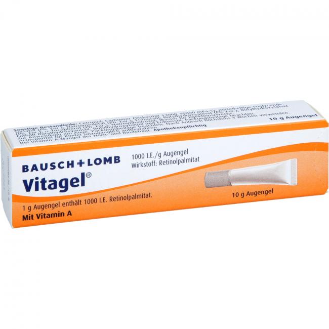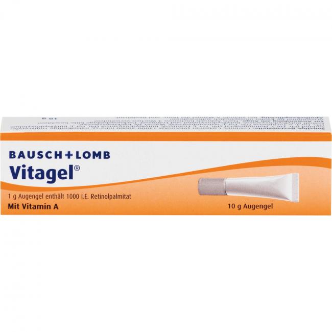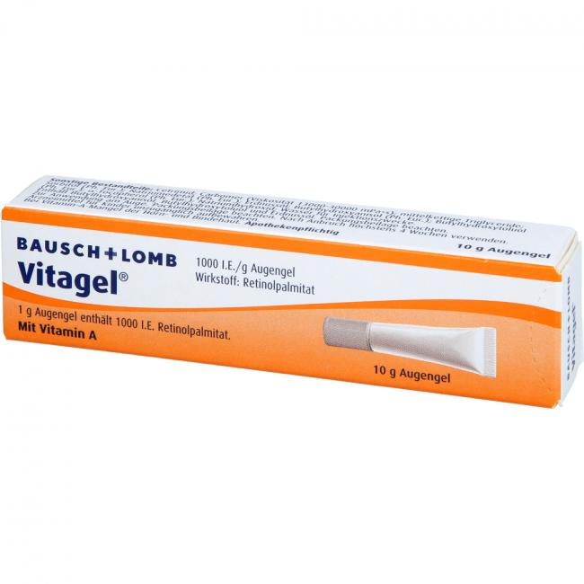 Vitagel 1000 I.E./g Augengel. Wirkstoff: Retinolpalmitat. Anwendungsgebiete: Unterstützende Behandlung von Vitamin-A-Mangel-bedingten atrophischen (durch Ernährungsstörungen bedingter Schwund) Zuständen der Horn- und Bindehaut wie Keratomalazie (Hornhauterkrankung) und Xerophthalmie (Austrocknung der Bindehaut und Hornhaut des Auges); unterstützende Behandlung bei trophischen Störungen der Horn- und Bindehaut mit Mucinmangel bei weitgehend erhaltenem wässrigen Tränenfilm. Warnhinweise: Enthält Butylhydroxyanisol, Butylhydroxytoluol und Erdnussöl.