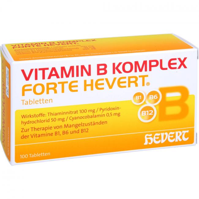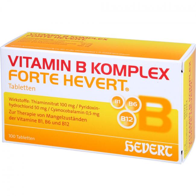 Vitamin B Komplex forte Hevert, Tabletten. Anwendungsgebiete: Zur Therapie nachgewiesener Mangelzustände der Vitamine B1, B6 und B12.