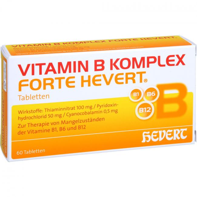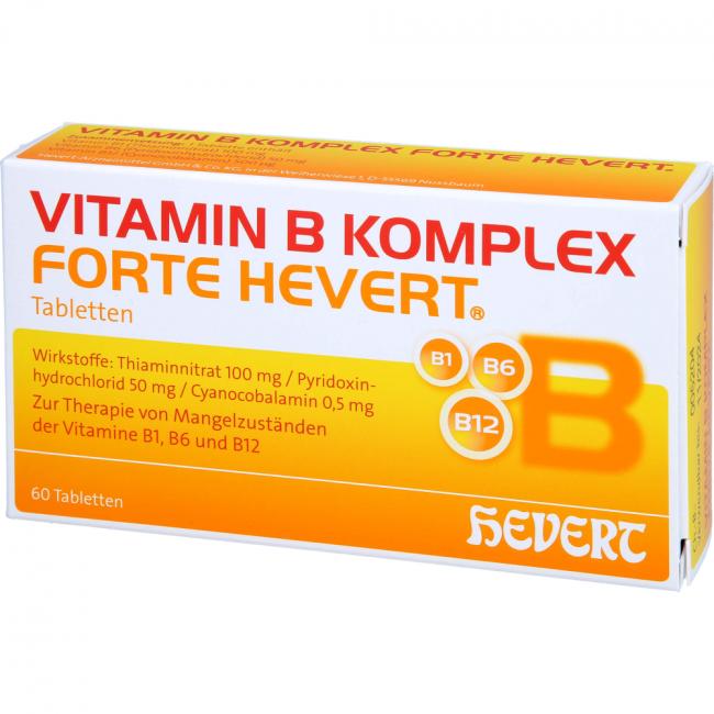 Vitamin B Komplex forte Hevert, Tabletten. Anwendungsgebiete: Zur Therapie nachgewiesener Mangelzustände der Vitamine B1, B6 und B12.