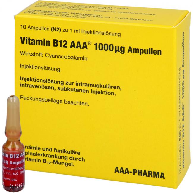 Vitamin B12 AAA 1.000 µg Ampullen. Wirkstoff: Cyanocobalamin. Anwendungsgebiete: bei Vitamin B12-Mangel, der ernährungsmäßig nicht behoben werden kann.