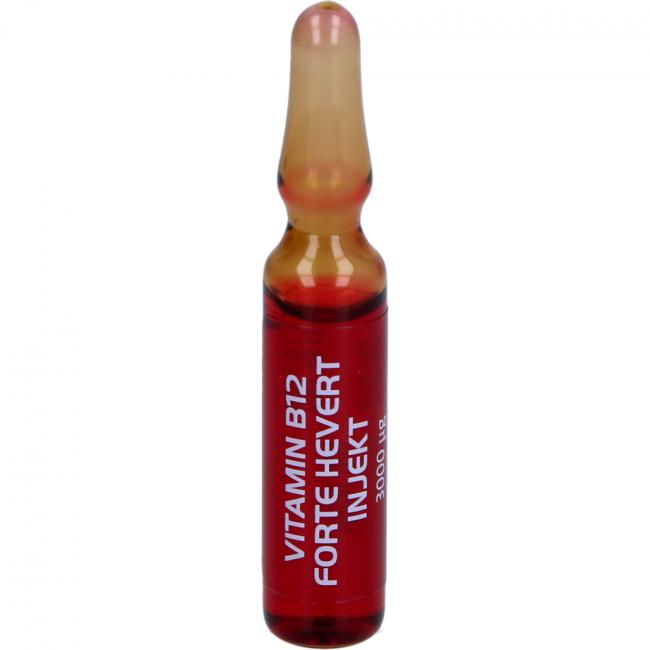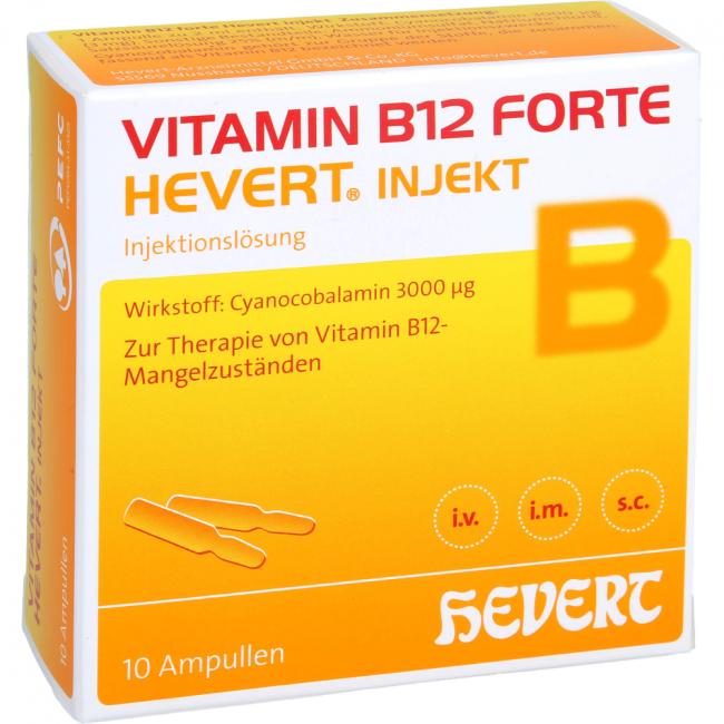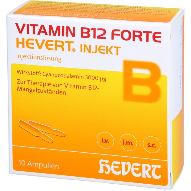 Vitamin B12 forte Hevert injekt, Injektionslösung. Wirkstoff: Cyanocobalamin 3000 µg. AnwendungsgeB1ete: Vitamin B12-Mangel, der ernährungsmäßig nicht behoben werden kann.