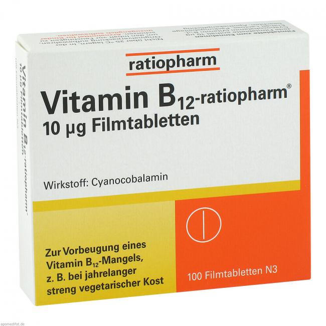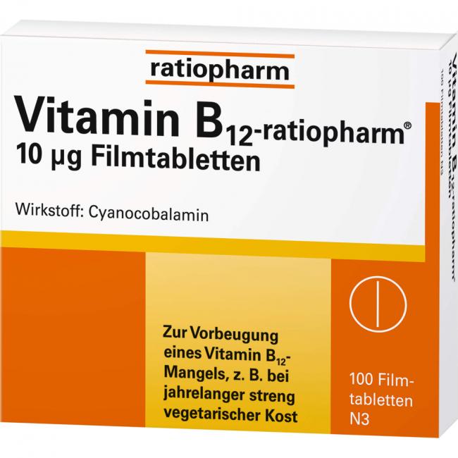 Vitamin B12-ratiopharm 10 µg Filmtabletten. Wirkstoff: Cyanocobalamin. Anwendungsgebiete: zur Verhütung eines Vitamin-B12-Mangels bei jahrelanger Mangel- und Fehlernährung (z.B. durch streng vegetarische Kost). Warnhinweis: Enthält Lactose!