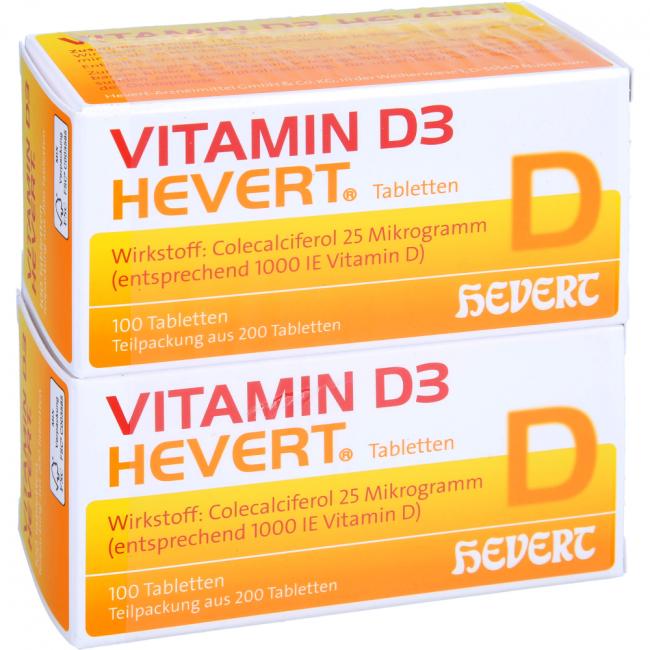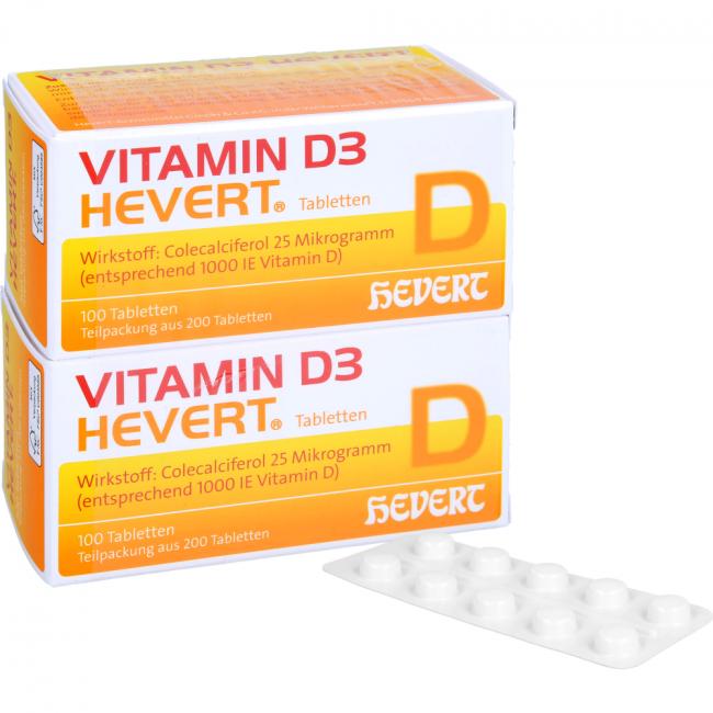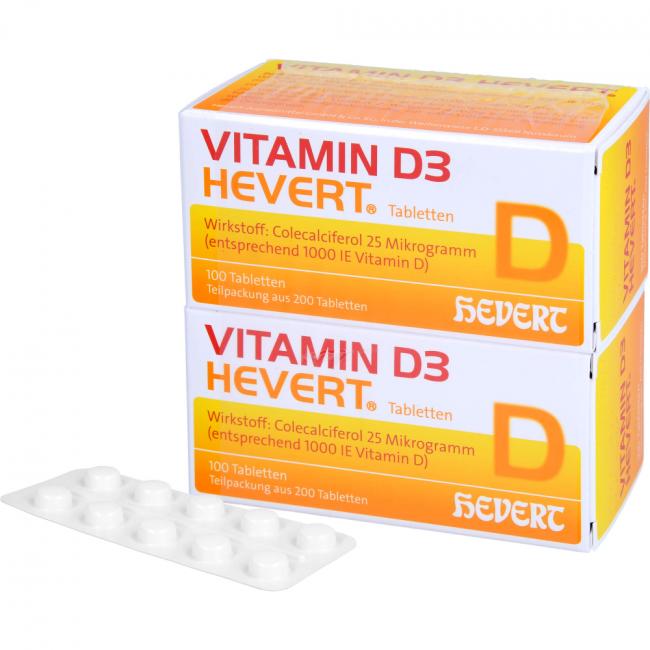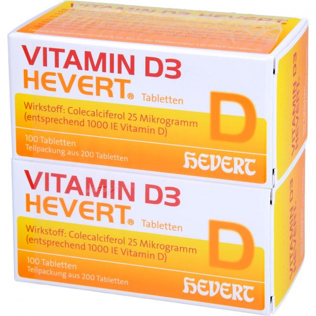 Vitamin D3 Hevert, Tabletten. Wirkstoff: Colecalciferol (Vitamin D3). Anwendungsgebiete: zur Vorbeugung bei erkennbarem Risiko einer Vitamin D-Mangelerkrankung bei ansonsten Gesunden ohne Resorptionsstörung (Störung der Aufnahme von Vitamin D im Darm); zur unterstützenden Behandlung der Osteoporose (Abbau des Knochengewebes); zur Vorbeugung gegen Rachitis (Verkalkungsstörung des Skeletts im Wachstumsalter); zur Vorbeugung gegen Rachitis bei Frühgeborenen.