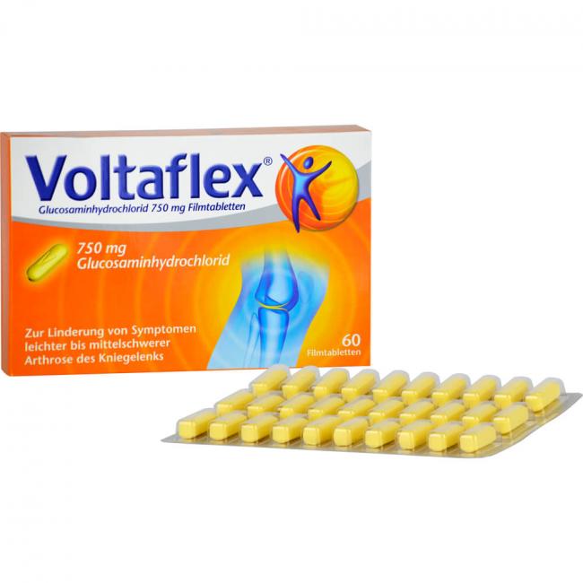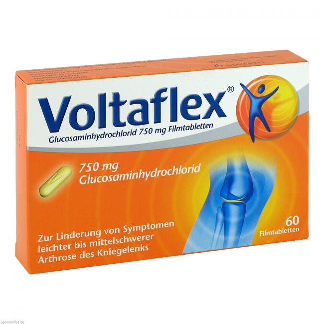 Voltaflex Filmtabletten Wirkstoff: Glucosaminhydrochlorid. Anwendungsgebiete: zur Linderung von Symptomen leichter bis mittelschwerer Arthrose (Degeneration) des Kniegelenks.