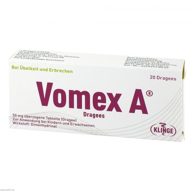 Vomex A Dragees sind ein Mittel gegen Übelkeit und Erbrechen aus der Gruppe der H1-Antihistaminika. Vomex A Dragees werden eingenommen zur Vorbeugung und Behandlung von Übelkeit und Erbrechen unterschiedlichen Ursprungs, insbesondere bei Reisekrankheit. Hinweis: Dimenhydrinat ist zur alleinigen Behandlung von Übelkeit und Erbrechen im Gefolge einer medikamentösen Krebsbehandlung (Zytostatika-Therapie) nicht geeignet. Wenn Sie sich nach 14 Tagen nicht besser oder gar schlechter fühlen, wenden Sie sich an Ihren Arzt.