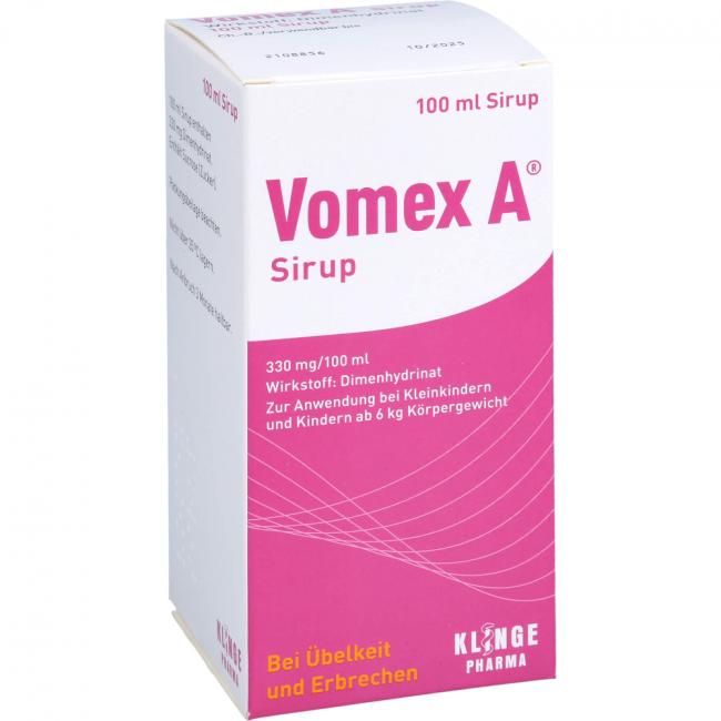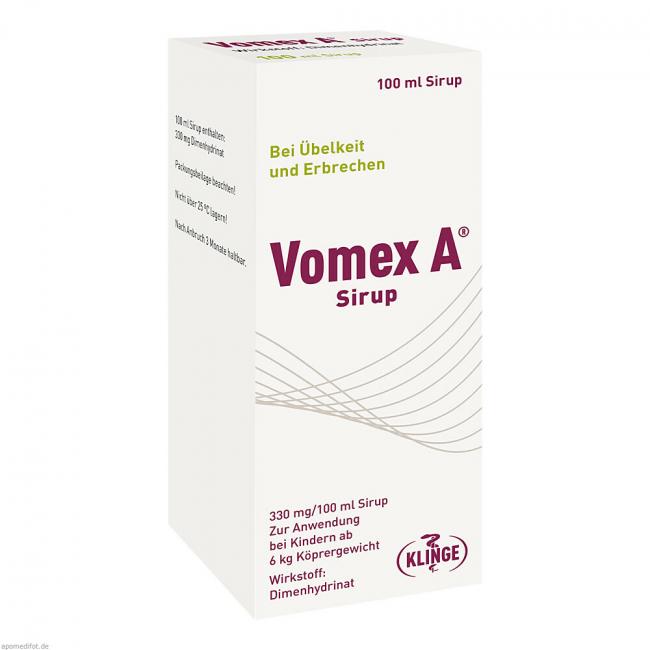 Überdosierung mit Dimenhydrinat, dem Wirkstoff von Vomex A, können insbesondere bei Kindern unter drei Jahren lebensbedrohlich sein und müssen deshalb in dieser Altersgruppe unter allen Umständen vermieden werden. 1 ml Sirup entspricht 3,3 mg Dimenhydrinat.