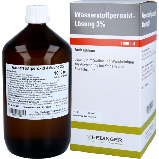 Wasserstoffperoxid-Lösung 3%. Wirkstoff: Wasserstoffperoxid-Lösung 30%. Anwendungsgebiete: Zur äußerlichen Reinigung von Wunden, Munddesinfiziens bei Mundgeruch, zum Spülen bei Zahnfleischblutungen und Mundschleimhautentzündungen.