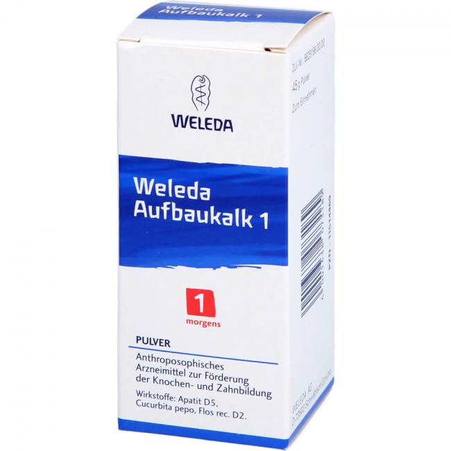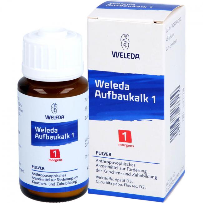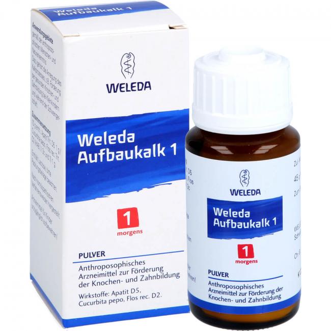 Weleda Aufbaukalk 1, Pulver morgens. Anwendungsgebiete: Gemäß der anthroposophischen Menschen- und Naturerkenntnis gehört zu den Anwendungsgebieten die Anregung des Kalkprozesses, z.B. Förderung der gesunden Knochen- und Zahnbildung bei Kleinkindern und während der Schwangerschaft.
