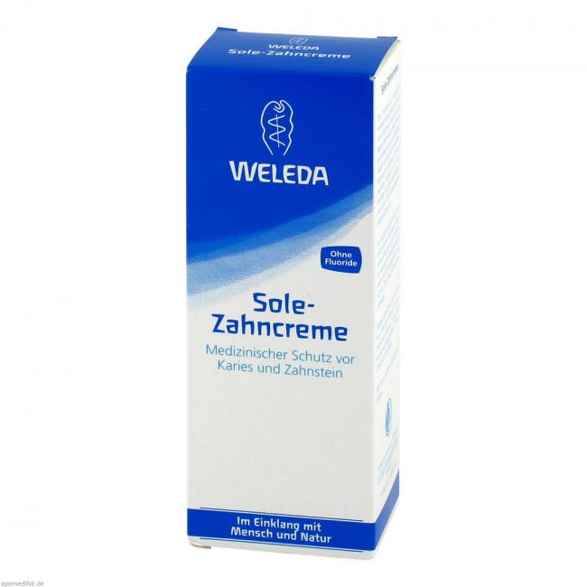Die Weleda Sole-Zahncreme mit einem löslichen Putzkörper aus Natriumcarbonat (Salz) beugt Karies durch die Neutralisation schädlicher Säuren vor und hemmt somit auch die Neubildung von Zahnstein. Der einzigartige Putzkörper aus Salzkristallen regt außerdem den Speichelfluss und damit die physiologische Selbstreinigung an. Der angenehm prickelnde, leicht salzige Geschmack der Sole-Zahncreme wird abgerundet durch anregendes Pfefferminzöl, das langanhaltende Frische schafft.