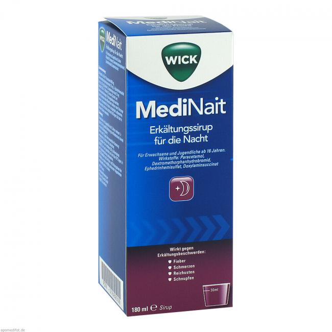 Dieses Arzneimittel enthält 18 Vol.-% Alkohol. Bei Beachtung der Dosierungsanleitung werden bei jeder Einnahme bis zu 4,3 g Alkohol (pro 30 ml) zugeführt. Vorsicht ist geboten. Dieses Arzneimittel darf nicht angewendet werden bei Leberkranken, Alkoholkranken, Epileptikern, Patienten mit organischen Erkrankungen des Gehirns, Schwangeren, Stillenden und Kindern. Die Wirkung anderer Arzneimittel kann beeinträchtigt oder verstärkt werden. Im Straßenverkehr und beim Bedienen von Maschinen kann das Reaktionsvermögen beeinträchtigt werden. Dieses Arzneimittel enthält Sucrose. Bitte nehmen Sie Wick MediNait Erkältungssirup erst nach Rücksprache mit Ihrem Arzt ein, wenn Ihnen bekannt ist, dass Sie unter einer Unverträglichkeit gegenüber bestimmten Zuckern leiden. 30 ml enthalten 8,25 g Sucrose (Zucker) entsprechend ca. 0,69 Broteinheiten (BE). Wenn Sie eine Diabetes-Diät einhalten müssen, sollten Sie dies berücksichtigen. 30 ml enthalten 3,5 mmol (80 mg) Natrium. Wenn Sie eine kochsalzarme Diät einhalten müssen, sollten Sie dies berücksichtigen.