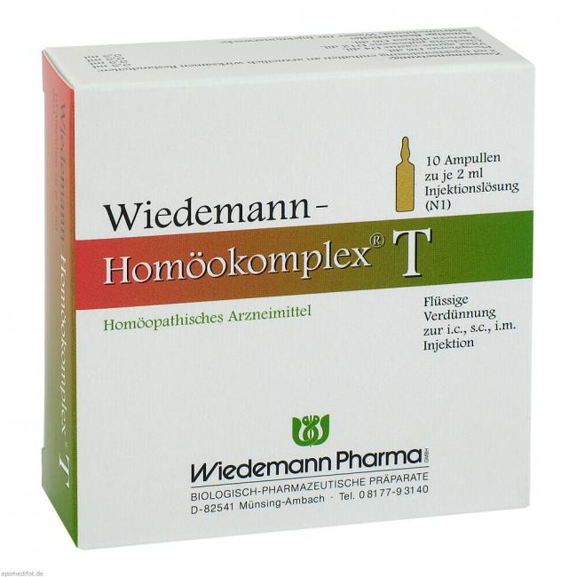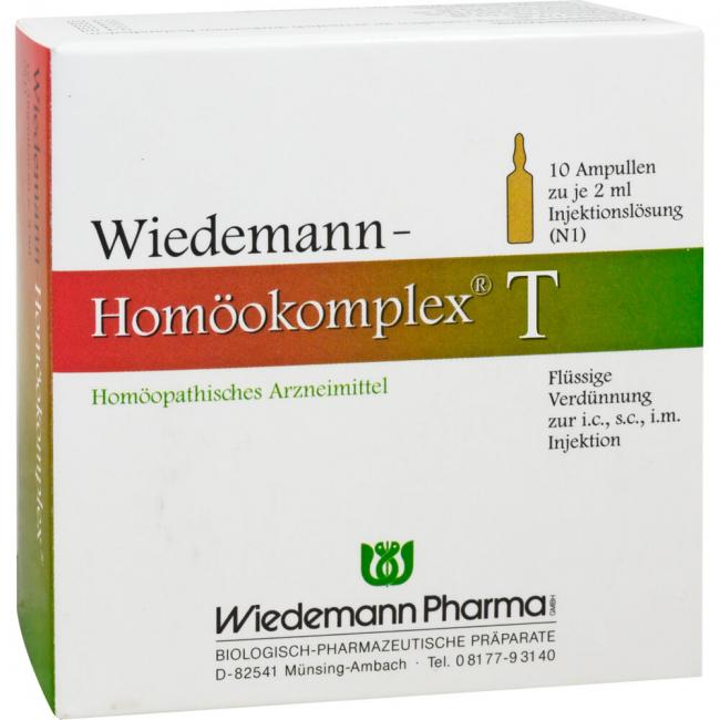 Wiedemann Homöokomplex T, Flüssige Verdünnung zur Injektion. Wirkstoffe: Phosphorus Dil. D8, Vitex agnus-castus Dil. D4, Cinchona pubescens Dil. D12, Turnera diffusa Dil. D6. Anwendungsgebiete: Registriertes homöopathisches Arzneimittel und daher ohne Angabe einer therapeutischen Indikation.