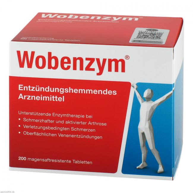 Wobenzym magensaftresistente Tabletten. Anwendungsgebiete: zur unterstützenden Behandlung bei Schwellungen, Entzündungen oder Schmerzen als Folge von Verletzungen, oberflächlicher Venenentzündung (Thrombophlebitis), Entzündung des Harn- und Geschlechtstrakts (Urogenitaltrakt), Schmerzhafte und aktivierte Arthrosen (chronische Gelenkabnutzung), Weichteilrheumatismus (Erkrankungsbild mit Beschwerden im Bereich von Muskeln, Sehnen, Bändern).