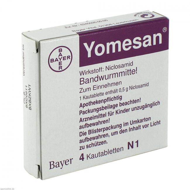 Wirkstoff: Niclosamid. Anwendungsgebiete: Yomesan wird angewendet bei Infektionen mit dem Rinderbandwurm (Taenia saginata), Schweinebandwurm (Taenia solium), Fischbandwurm (Diphyllobothrium latum), Zwergbandwurm (Hymenolepis nana).