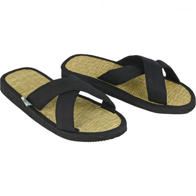 Die luftigen und bequemen Zehentrenner oder Riemen Slipper sind seit Jahren der Sommertrend. Kaum treffen die ersten Sonnenstrahlen auf die Erde, schon wird die trendige Fußbekleidung spazieren geführt. Bezeichnend ist die feine und luftdurchlässige Verarbeitung des Schilfes in der Fußsohle. Durch das sanfte Verweben der einzelnen Schilfblätter wird die Luftzirkulation zwischen Fuß und Sohle positiv beeinflusst und das eingearbeitete Zimtpulver kann sanft den Duft an die Fußsohle abgeben. Das Zimtpulver ist von einer dünnen Baumwollschicht umgeben, so dass überschüssige Feuchtigkeit aufgenommen und vom Fuß abtransportiert werden kann. In den Tönen schwarz und braun gibt Ihnen dieser Zimtlatschen idealen Halt. Ihr Fuß wird umfasst von zwei breiten, über Kreuz gehaltenen Bändern. Ohne Mittelsteg.